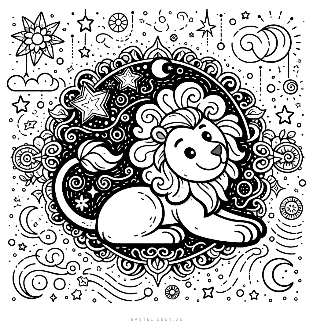 Dieses bezaubernde Ausmalbild zeigt das Sternzeichen Löwe, dargestellt durch einen verspielten und majestätischen Löwen. Umgeben von himmlischen Elementen wie Sternen, Monden und filigranen Mustern.