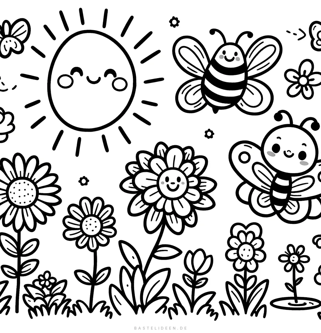 Verschönere deinen Tag mit dieser charmanten Malvorlage, die nur so vor Lächeln strotzt! Die fröhliche Sonne, glückliche Bienen und freundliche Blumen erschaffen eine spielerische Gartenszene, die nur darauf wartet, mit deiner Kreativität zum Leben erweckt zu werden.