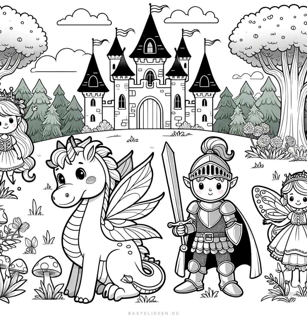 Betrete ein magisches Königreich mit dieser bezaubernden Malvorlage! Mit einem märchenhaften Schloss, einem fröhlichen Drachen, einem tapferen kleinen Ritter und zauberhaften Prinzessinnen ist es die perfekte Szene, um deine Fantasie anzuregen.