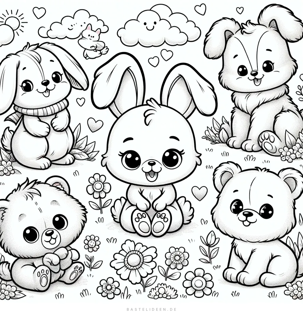 Entdecke eine Welt voller entzückender Abenteuer mit dieser zauberhaften Malvorlage! Mach dich bereit, die süßeste Runde tierischer Freunde kennenzulernen - Hündchen, Häschen und ein bezaubernder kleiner Bär - die alle darauf warten, von dir bunt zum Leben erweckt zu werden.