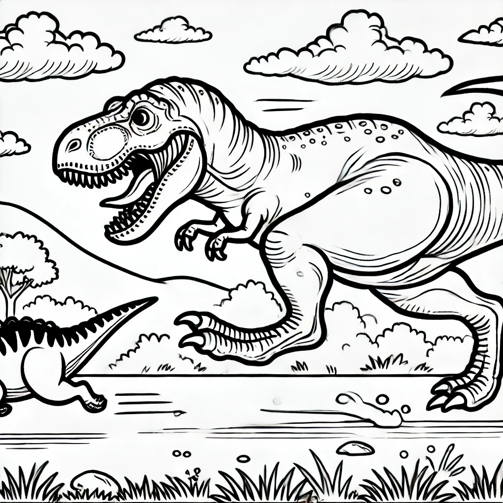 Dynamische Ausmalvorlage eines mächtigen T-Rex, der auf der Jagd rennt und seine Stärke zeigt.