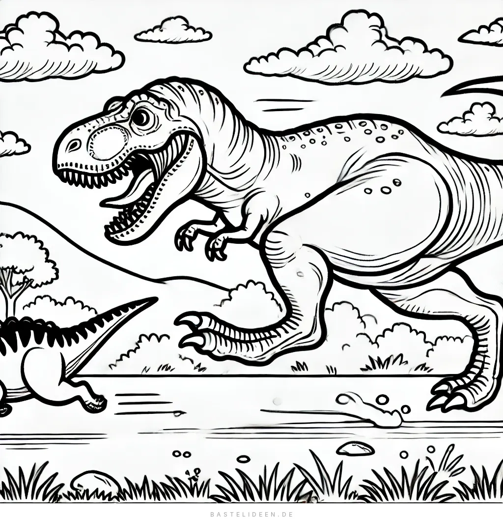 Dynamische Ausmalvorlage eines mächtigen T-Rex, der auf der Jagd rennt und seine Stärke zeigt.