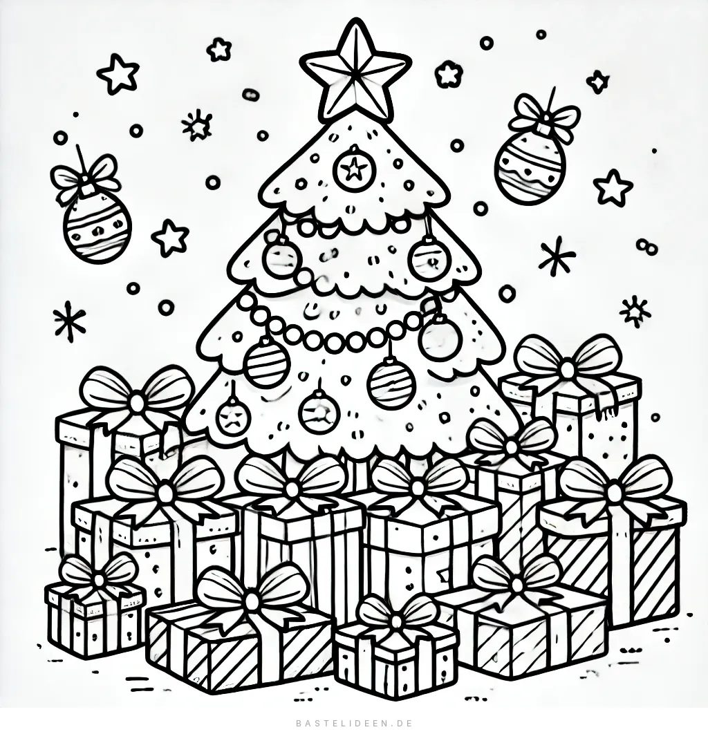Diese festliche Malvorlage zeigt einen wunderschön geschmückten Tannenbaum, der von einem Berg an verpackten Geschenken umgeben ist. Der Baum ist mit Kugeln, Girlanden und einem Stern an der Spitze verziert.