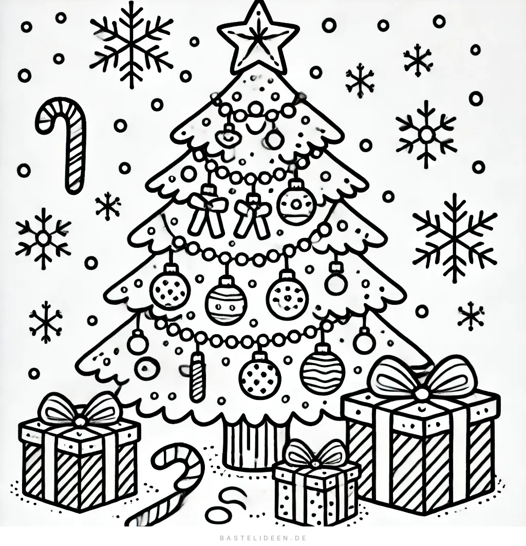 Komm in Weihnachtsstimmung mit dieser wunderschön geschmückten Tannenbaum-Malvorlage! Der detailreiche Baum ist mit Kugeln, Girlanden und Schmuck verziert, umgeben von Geschenken, Zuckerstangen und Schneeflocken.