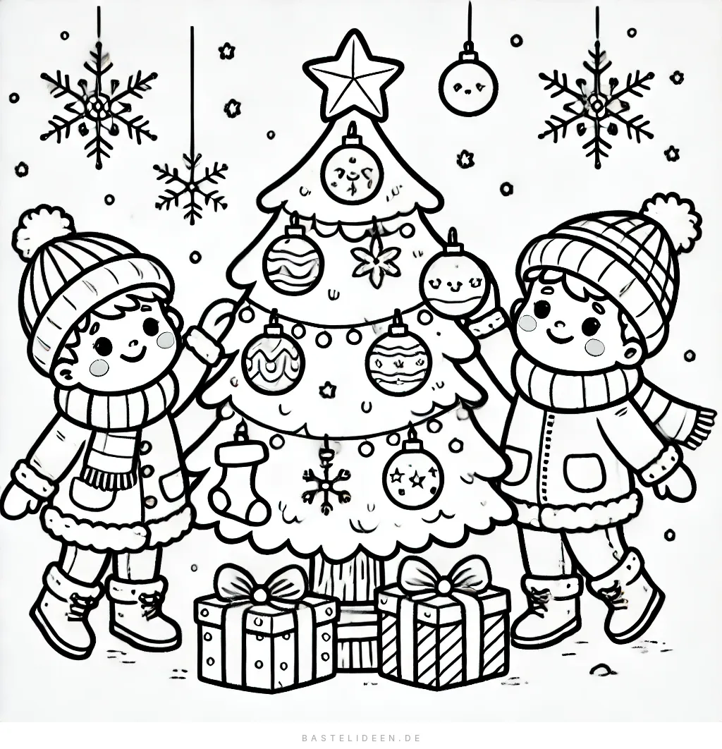 Diese niedliche Malvorlage zeigt zwei fröhliche Kinder, die einen Weihnachtsbaum schmücken, umgeben von hängenden Schneeflocken, Kugeln und Geschenken unter dem Baum.
