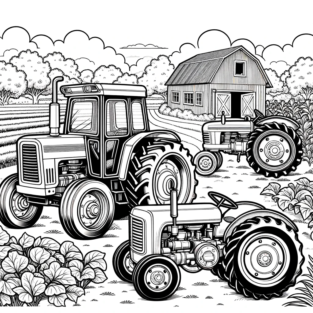 Eine Malvorlage mit drei verschiedenen Traktoren auf einem Bauernhof. Jeder Traktor ist einzigartig und befindet sich in verschiedenen Umgebungen wie in der Nähe einer Scheune, auf einem Feld und bei einem Gemüsegarten.