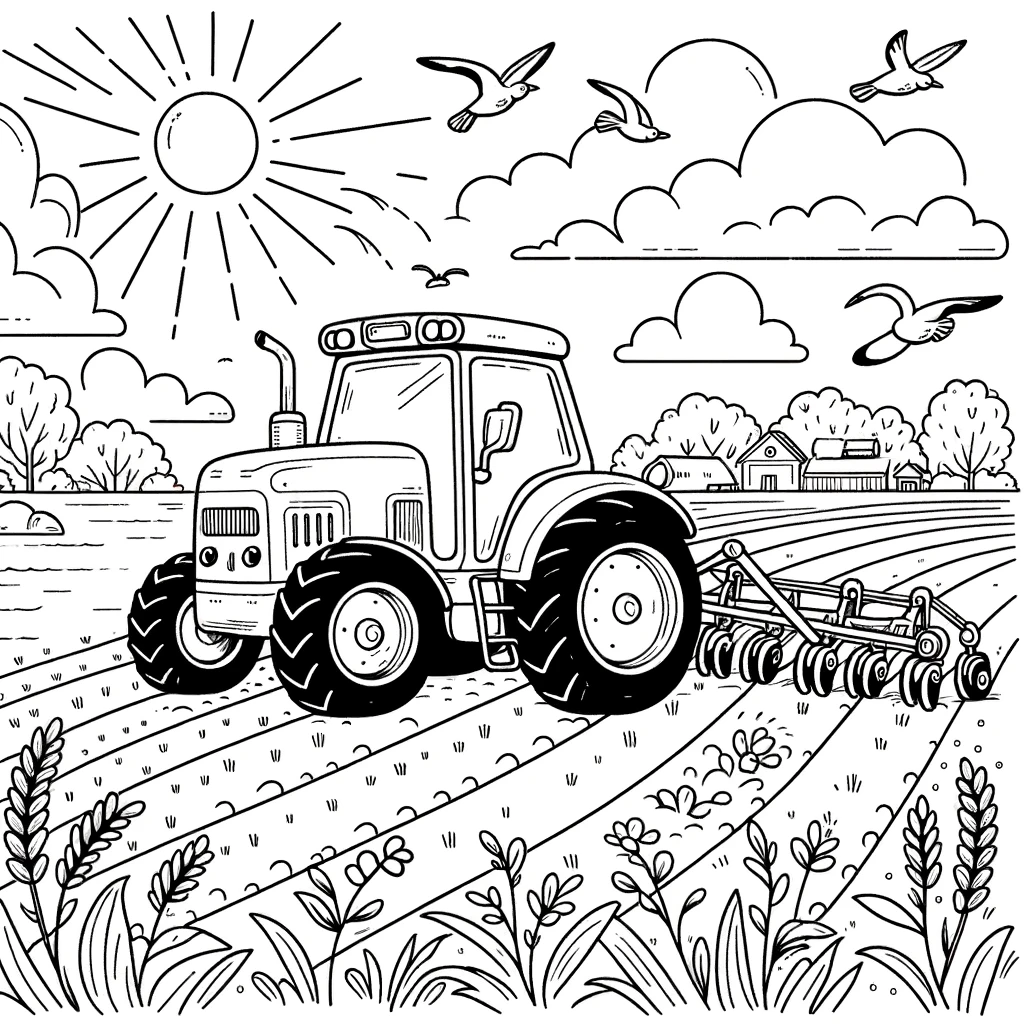 Eine Traktor-Malvorlage für Kinder mit einem Traktor, der unter einem sonnigen Himmel auf dem Feld arbeitet, mit überfliegenden Vögeln.