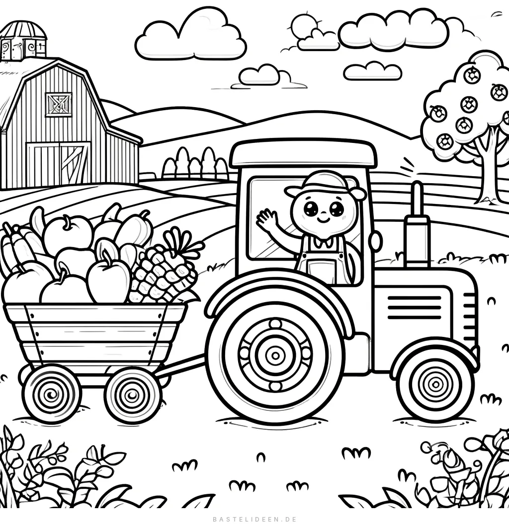Eine entzückende Traktor-Malvorlage für Kinder mit einem kleinen Traktor, der einen Wagen voller Obst und Gemüse zieht, mit einer Farm und einem fröhlichen Bauern im Hintergrund.
