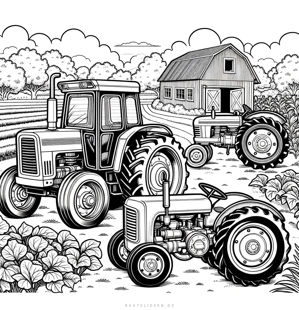 Eine Malvorlage mit drei verschiedenen Traktoren auf einem Bauernhof. Jeder Traktor ist einzigartig und befindet sich in verschiedenen Umgebungen wie in der Nähe einer Scheune, auf einem Feld und bei einem Gemüsegarten.