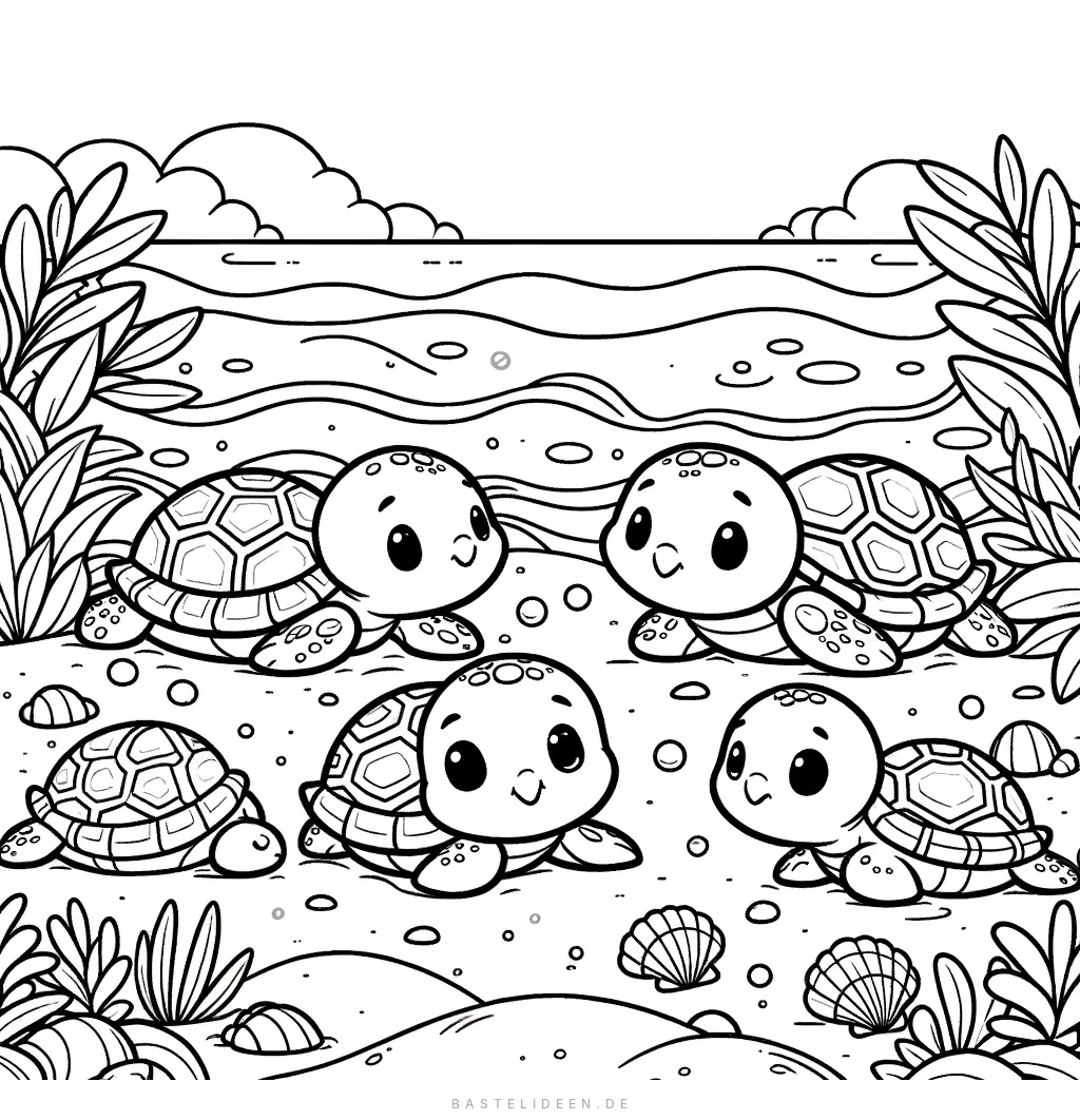 Diese reizende Ausmalbilder zeigt eine Gruppe fröhlicher Meeresschildkröten, die sich am sandigen Strand versammeln, während im Hintergrund sanft die Wellen schlagen. Das Bild zeigt diese niedlichen Kreaturen mit ausdrucksstarken Augen und detaillierten Panzern, umgeben von Muscheln und Pflanzen.