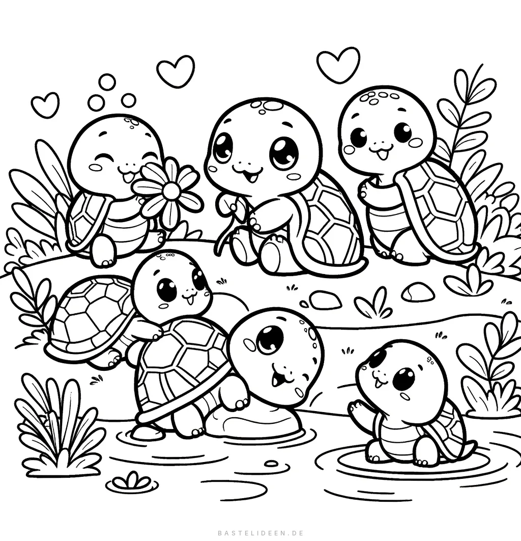 Diese reizende Ausmalbilder zeigt eine Gruppe verspielter Schildkröten, die ihre Zeit an einem ruhigen Teich geniessen. Die Szene ist gefüllt mit niedlichen Schildkröten, die miteinander interagieren, einige halten Blumen, während andere im Wasser planschen, umgeben von üppigen Pflanzen und Herzen.