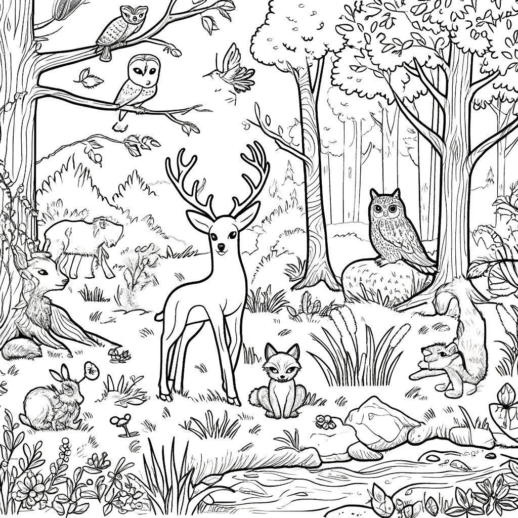 Auf dieser ruhigen Ausmalseite tummeln sich verschiedene Waldbewohner wie Hirsch, Fuchs, Eule und Hase, die einen friedlichen Moment im Wald geniessen.