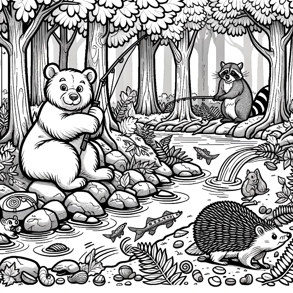 Dieses entzückende Ausmalbild zeigt eine charmante Waldszene, in der ein Bär und ein Waschbär einen friedlichen Angeltag am Fluss geniessen.