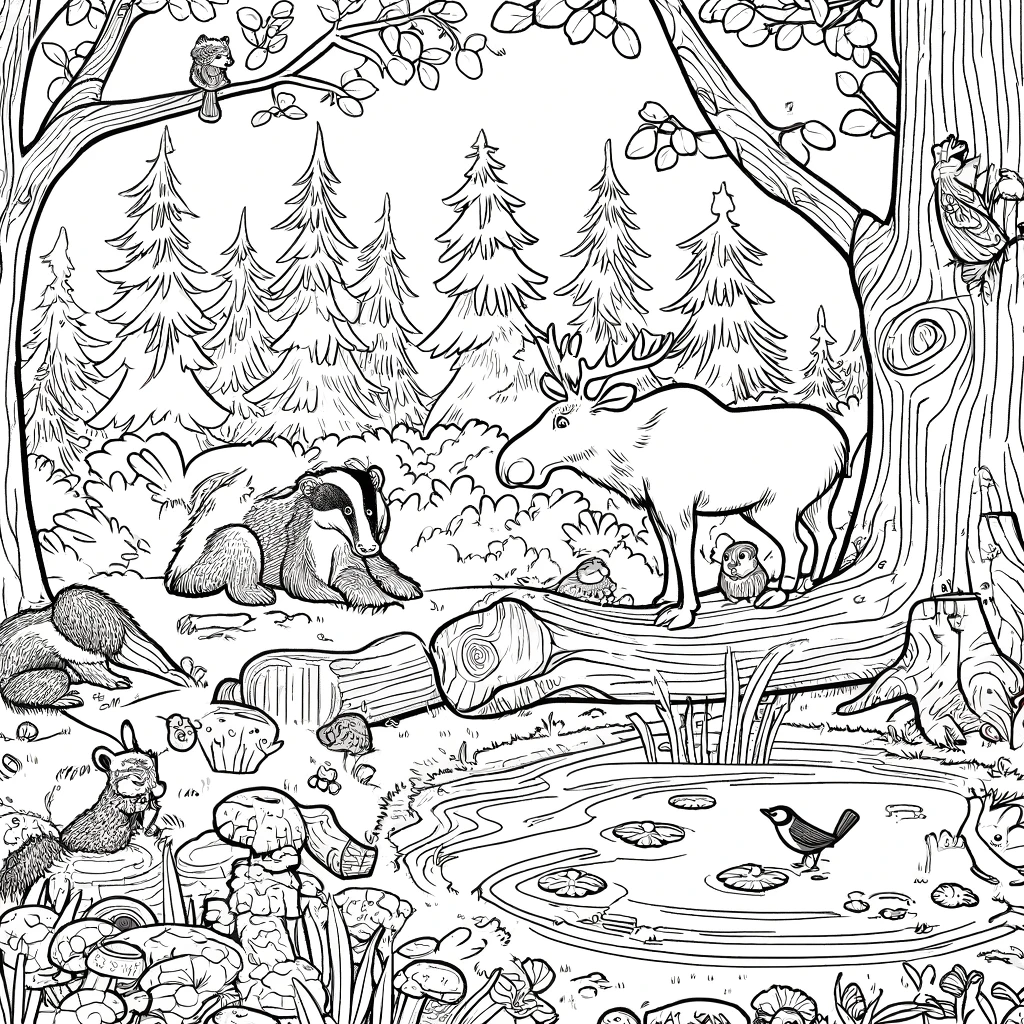 Dieses fesselnde Ausmalbild zeigt ein lebhaftes Waldtreffen mit einem majestätischen Elch auf einem Baumstamm und einem Dachs im Gras.