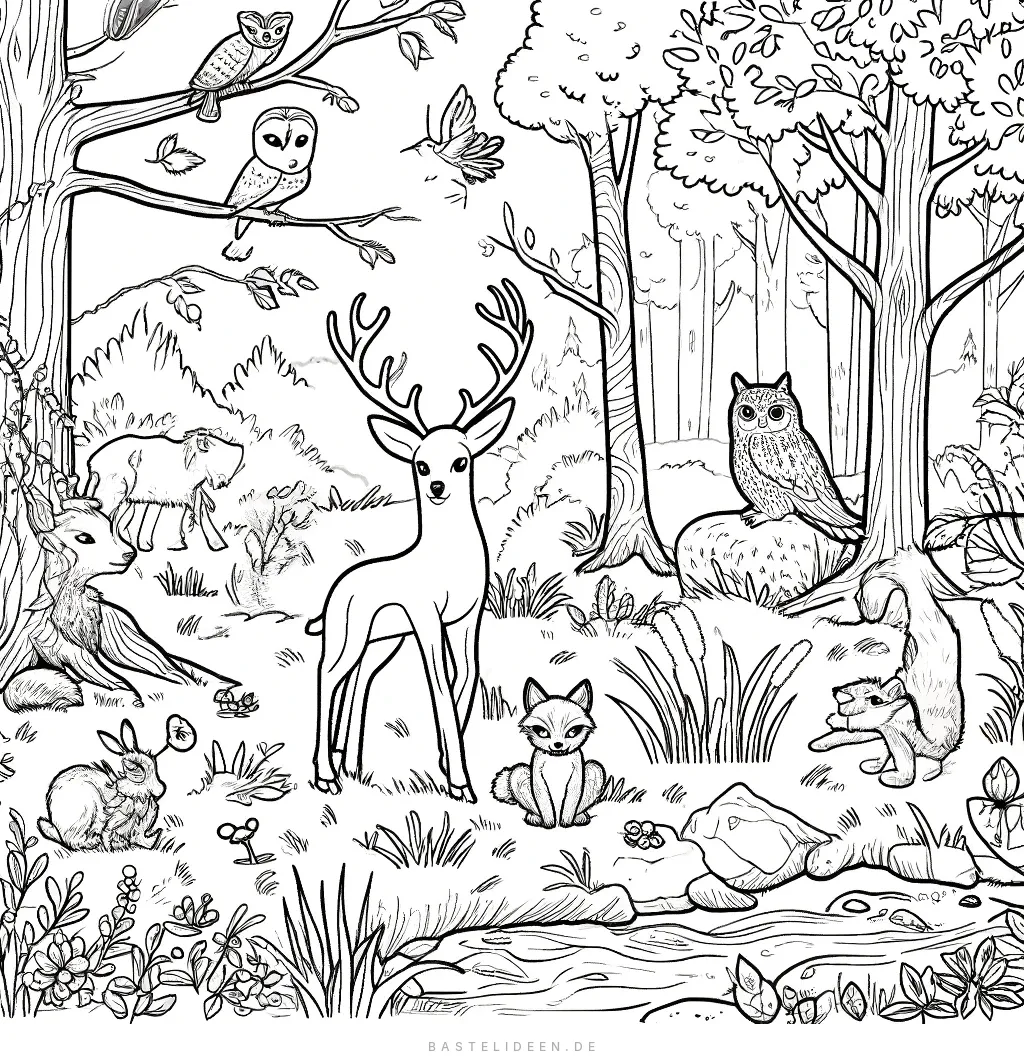 Auf dieser ruhigen Ausmalseite tummeln sich verschiedene Waldbewohner wie Hirsch, Fuchs, Eule und Hase, die einen friedlichen Moment im Wald geniessen.