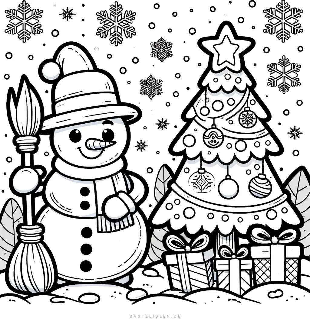 Tauch ein in ein verschneites Paradies mit diesem bezaubernden Weihnachts-Ausmalbild! Diese herzerwärmende Szene zeigt einen fröhlichen Schneemann mit Zylinder und Besen, der neben einem wunderschön geschmückten Weihnachtsbaum steht, umgeben von verpackten Geschenken.