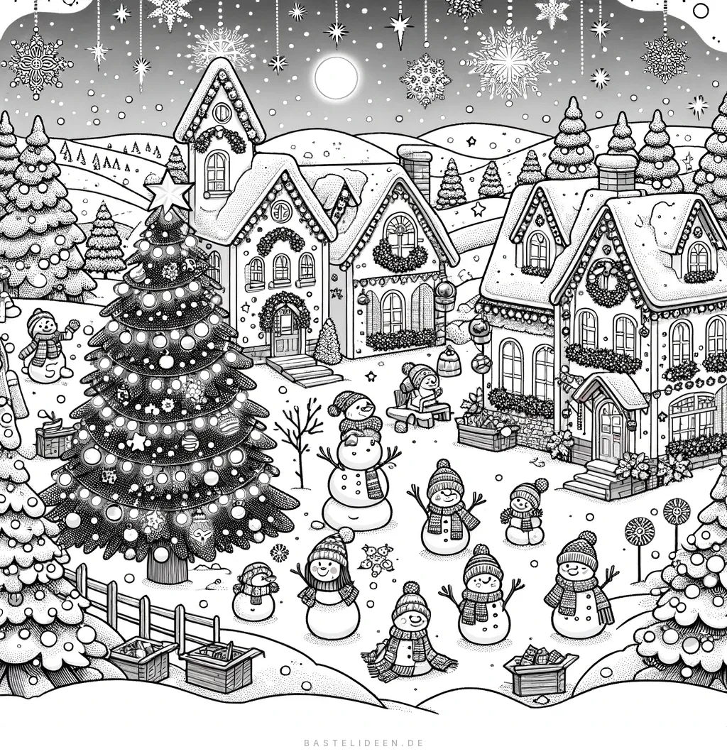 Erfasse die Magie der Festtage mit diesem verzaubernden Weihnachts-Ausmalbild! Geschmückt mit einem funkelnden Weihnachtsbaum, fröhlichen Schneemännern und malerischen Häuschen unter einem Sternenhimmel, wartet diese Szene darauf, mit deinen Farben in ein Winterwunderland verwandelt zu werden.