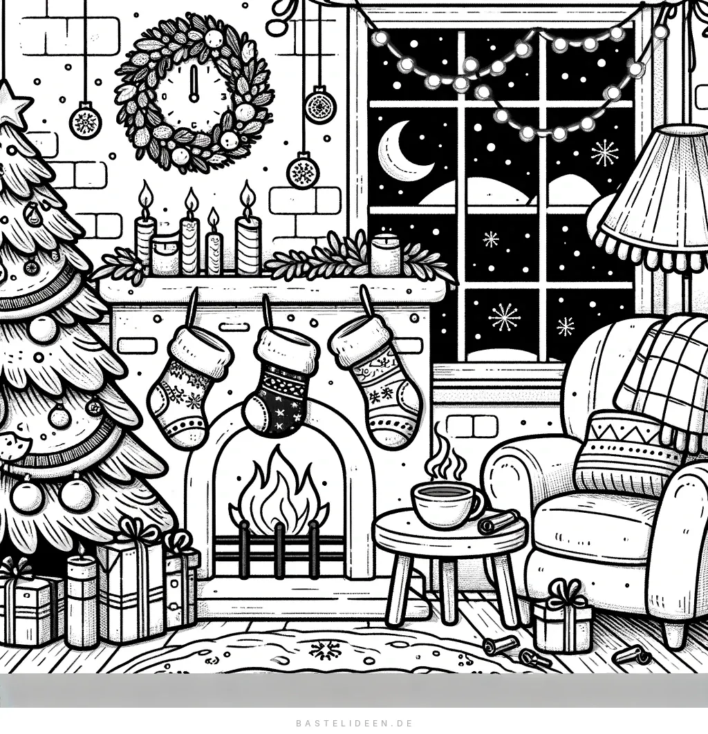 Lass dich von der gemütlichen Wärme der Festtage mit diesem detailreich gestalteten Weihnachts-Ausmalbild verzaubern. Diese festliche Szene präsentiert einen üppig dekorierten Weihnachtsbaum mit funkelnden Lichtern, einen einladenden Kamin geschmückt mit einem üppigen Kranz und Strümpfen, und viele liebevoll verpackte Geschenke.
