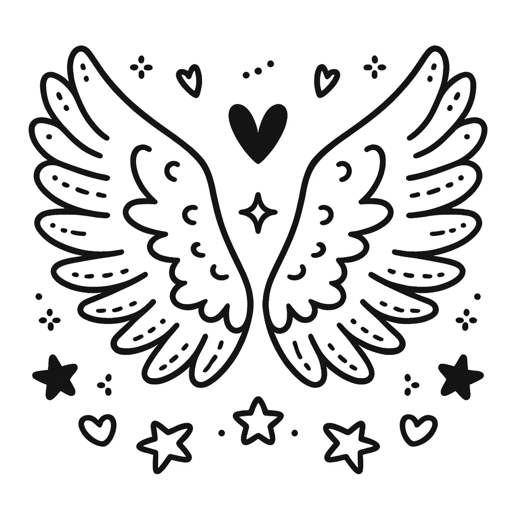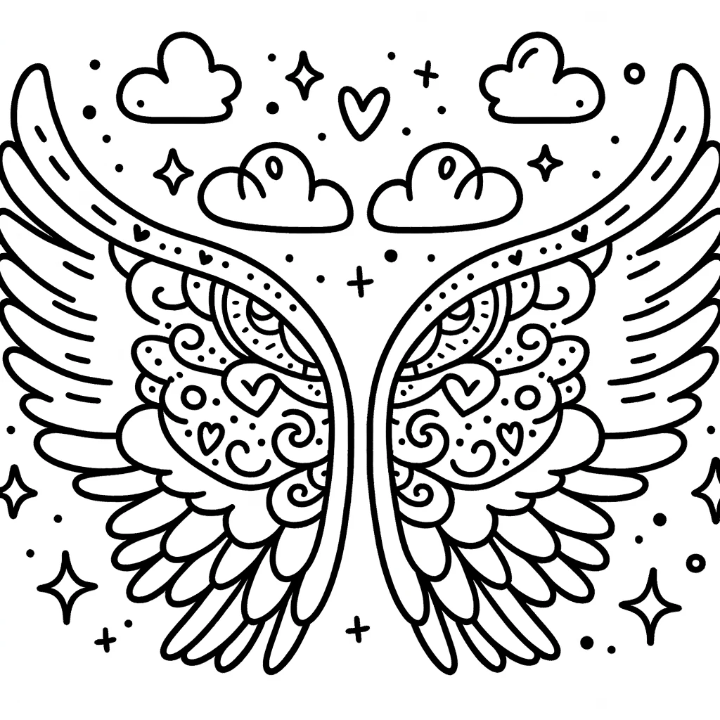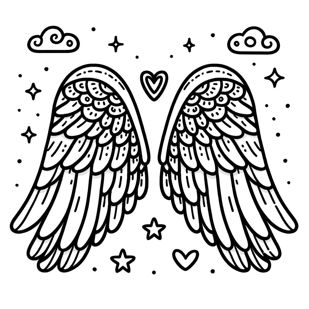 Diese faszinierende Malvorlage zeigt ein Paar verzierter Flügel, geschmückt mit detaillierten Federn und umgeben von Sternen, Herzen und Wolken. Das wunderschöne Design lädt dich ein, deine Lieblingsfarben zu verwenden, um diese bezaubernde Szene zum Leben zu erwecken.