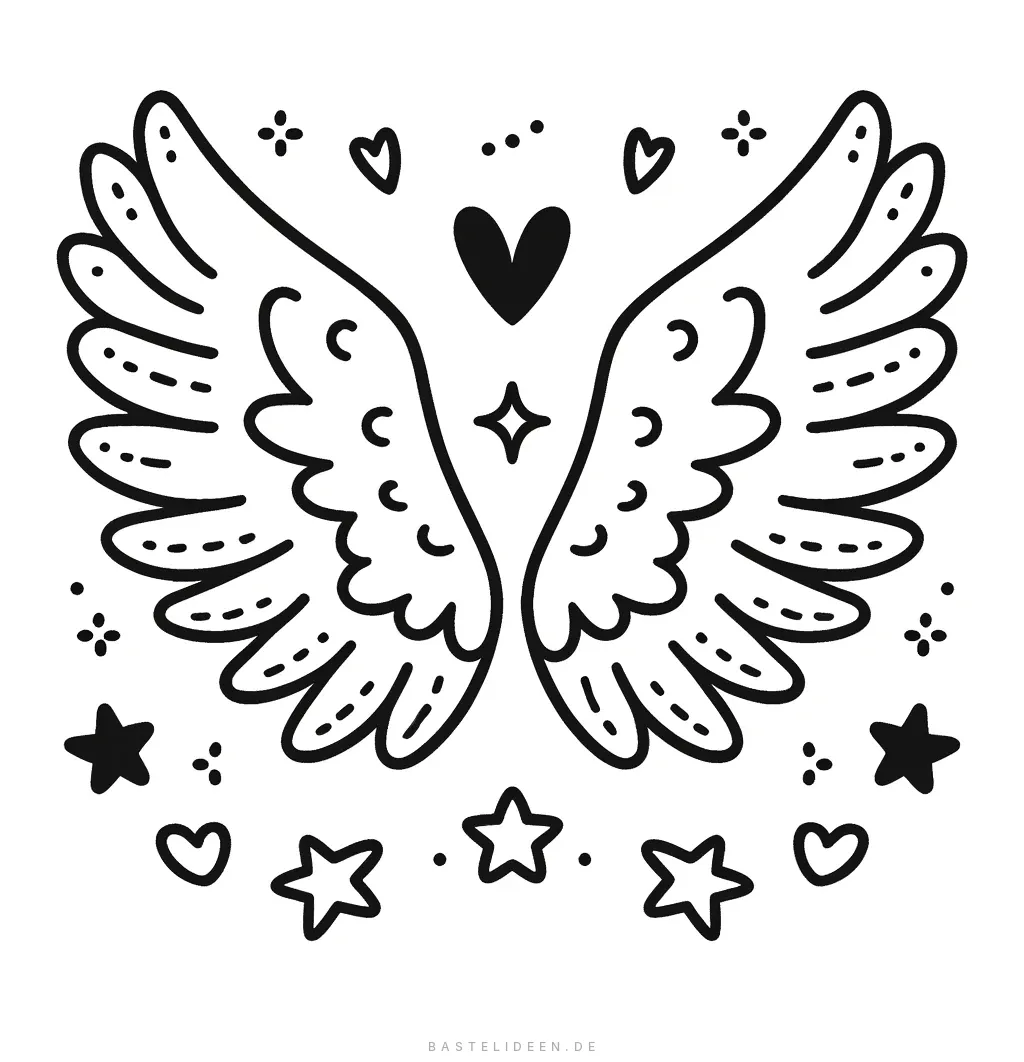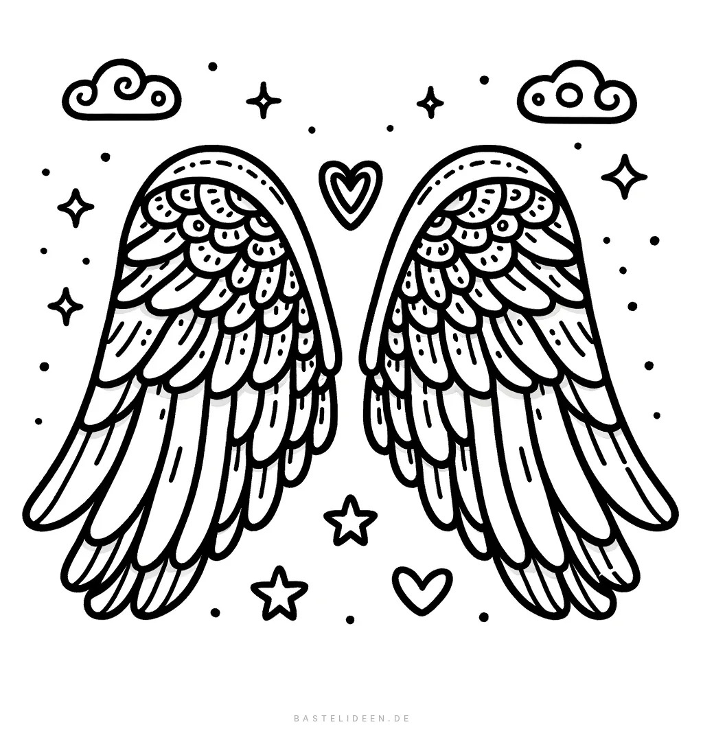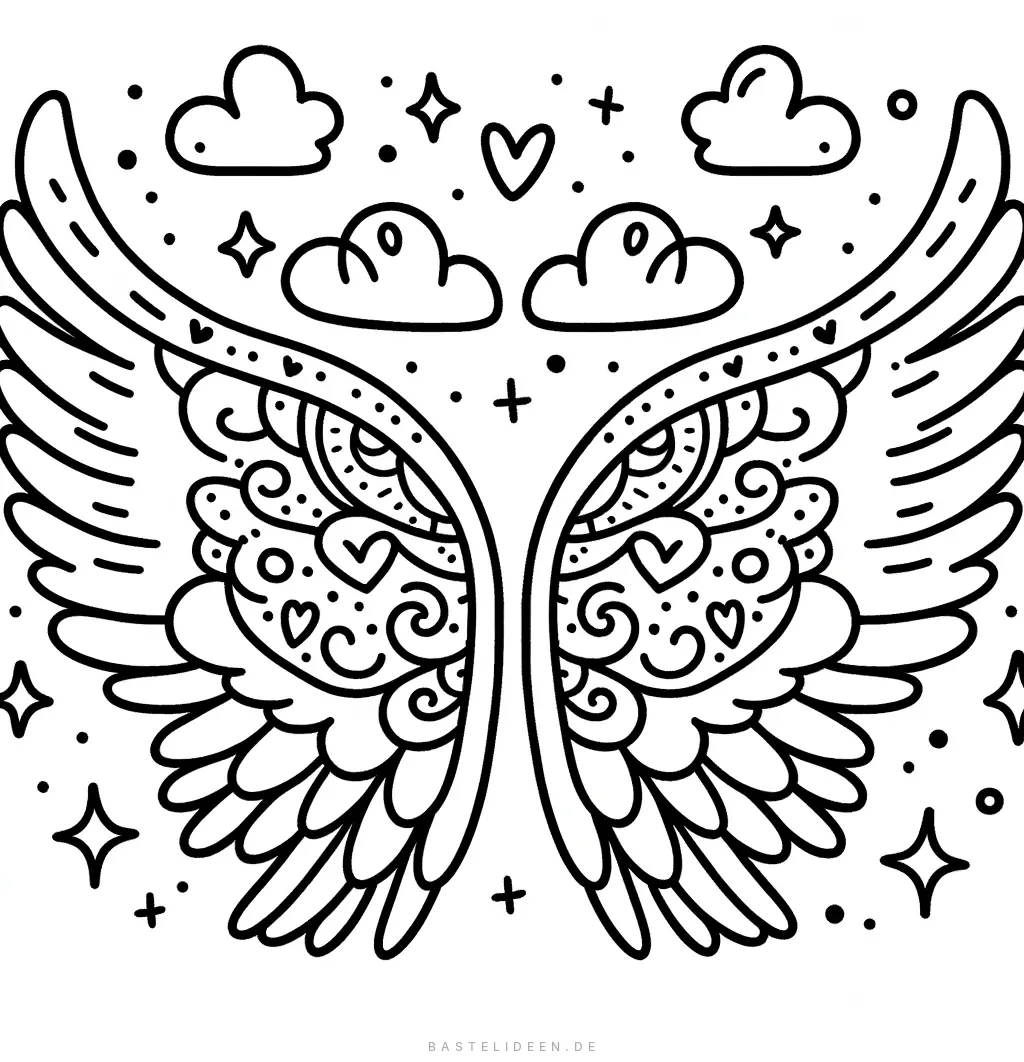 Diese faszinierende Malvorlage zeigt ein Paar verzierter Flügel, geschmückt mit detaillierten Federn und umgeben von Sternen, Herzen und Wolken. Das wunderschöne Design lädt dich ein, deine Lieblingsfarben zu verwenden, um diese bezaubernde Szene zum Leben zu erwecken.