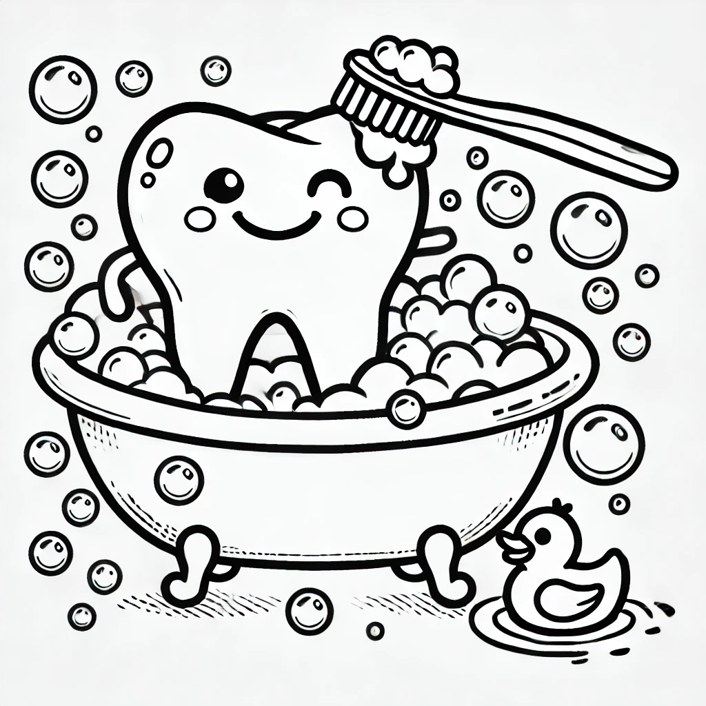 Auf diesem fröhlichen Ausmalbild genießt ein glücklicher Zahn ein Schaumbad in einer nostalgischen Badewanne, während eine Zahnbürste ihm zusätzlichen Schaum auf den Kopf zaubert. Ein niedliches Quietscheentchen schwimmt daneben und verleiht der Szene einen spielerischen Touch.