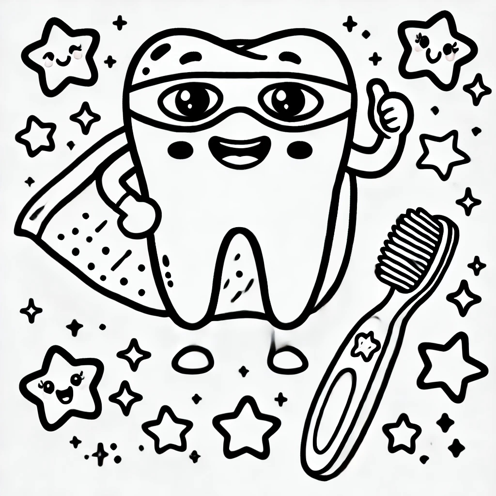 Auf diesem lustigen und lebhaften Ausmalbild siehst du einen Superhelden-Zahn, komplett mit Umhang und Maske, umgeben von fröhlichen Sternen und einer treuen Zahnbürste. Kinder werden es lieben, diesen heldenhaften Zahn mit Farben zum Leben zu erwecken.