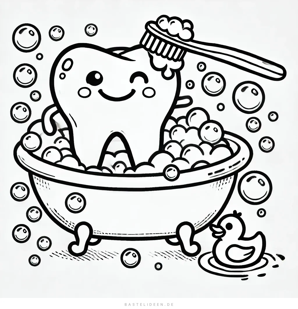 Auf diesem fröhlichen Ausmalbild genießt ein glücklicher Zahn ein Schaumbad in einer nostalgischen Badewanne, während eine Zahnbürste ihm zusätzlichen Schaum auf den Kopf zaubert. Ein niedliches Quietscheentchen schwimmt daneben und verleiht der Szene einen spielerischen Touch.