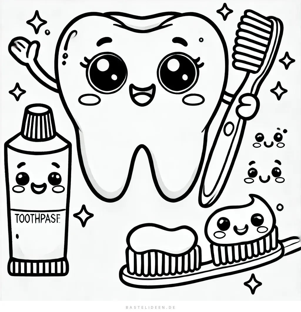 Auf diesem niedlichen Ausmalbild siehst du einen fröhlichen Zahn, der eine Zahnbürste hält, begleitet von einer lächelnden Zahnpastatube und einer putzfreudigen Zahnbürste. Es ist eine tolle Möglichkeit für Kinder, Spaß zu haben und gleichzeitig etwas über Zahnpflege zu lernen.