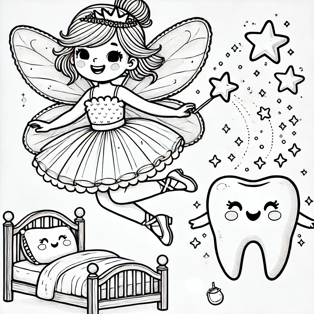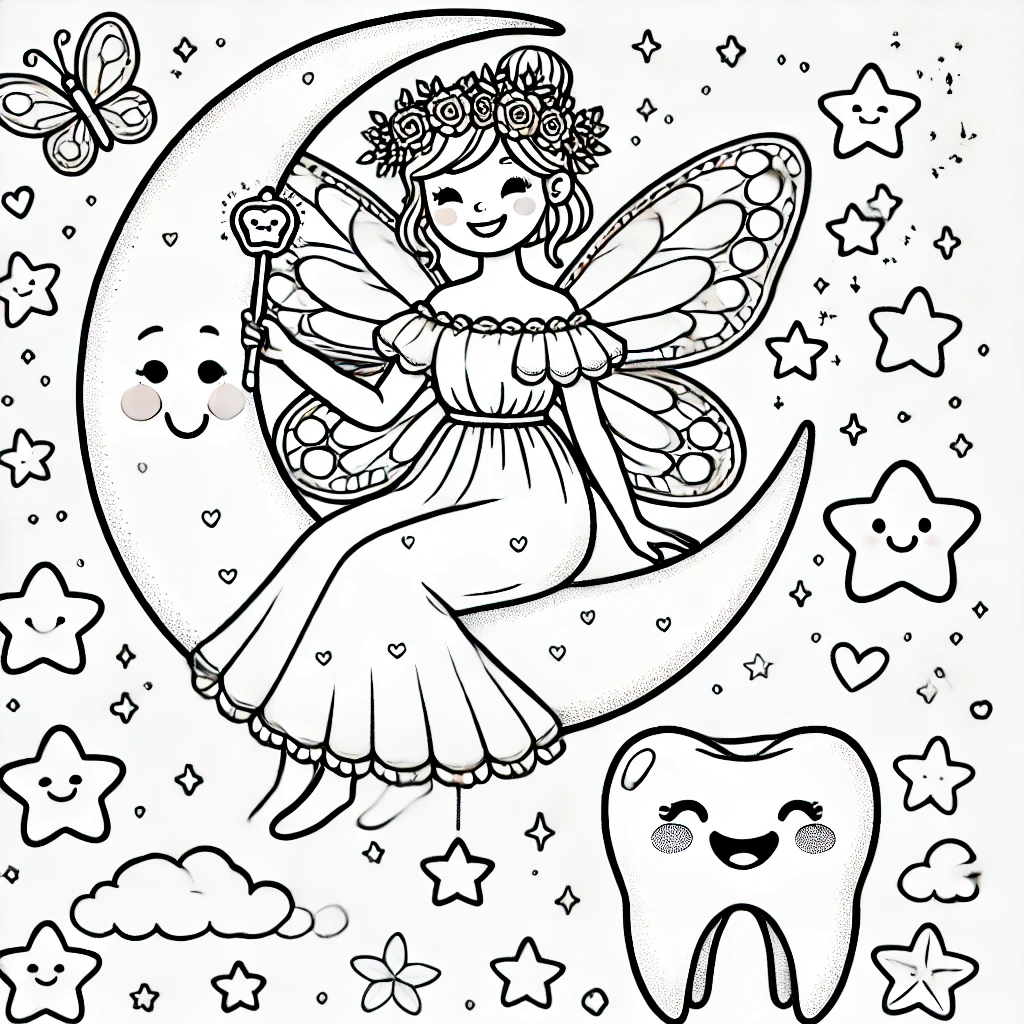 Dieses bezaubernde Ausmalbild zeigt eine anmutige Zahnfee, die auf einem Halbmond sitzt, eine Blumenkrone trägt und einen Zauberstab mit einer süßen Zahnspitze hält. Ihre Schmetterlingsflügel breiten sich elegant aus, während sie von lächelnden Sternen und Schmetterlingen umgeben ist.