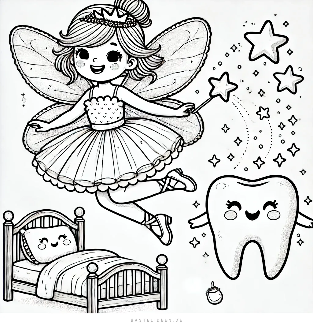 Dieses bezaubernde Ausmalbild zeigt eine anmutige Zahnfee, die auf einem Halbmond sitzt, eine Blumenkrone trägt und einen Zauberstab mit einer süßen Zahnspitze hält. Ihre Schmetterlingsflügel breiten sich elegant aus, während sie von lächelnden Sternen und Schmetterlingen umgeben ist.