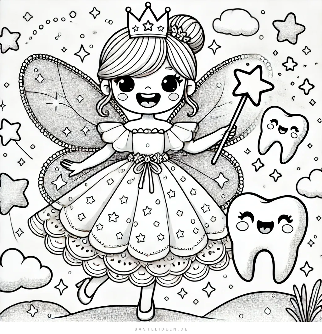 Dieses süße Ausmalbild zeigt eine fröhliche Zahnfee in einem fließenden Kleid mit Sternmustern und einer Krone auf dem Kopf. In der Hand hält sie einen Zauberstab mit einem Stern an der Spitze, während glückliche Zähne um sie herum schweben.