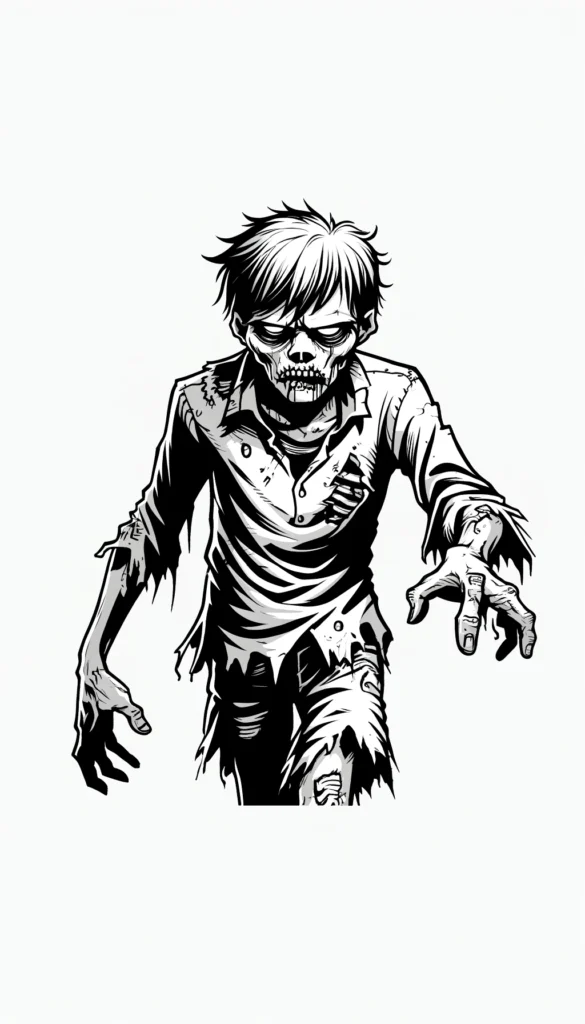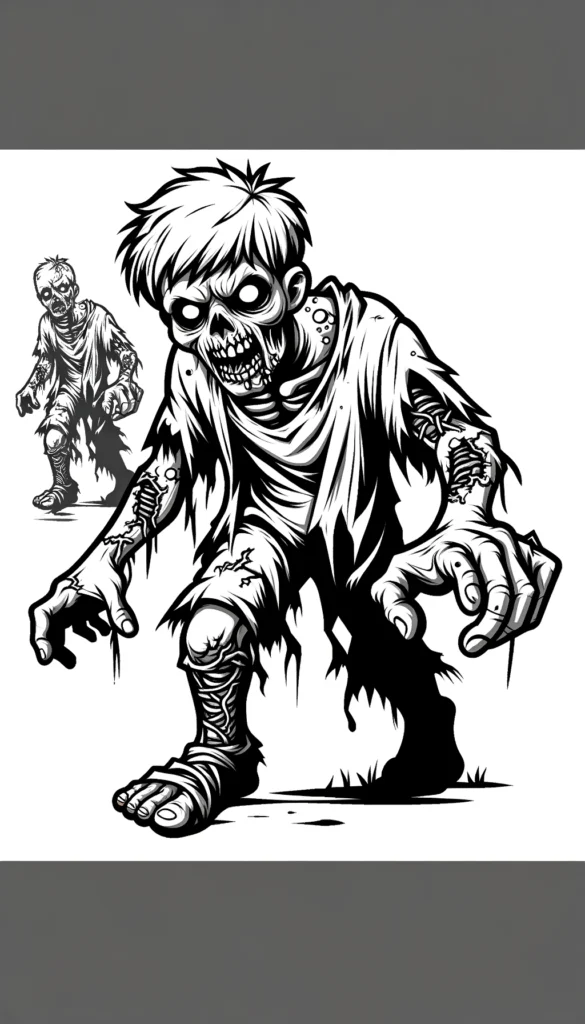 Das Bild zeigt eine klassische Darstellung eines Zombies mit zerfetzten Kleidern und einer bedrohlichen Haltung. Diese Figur, mit ihrem ausgemergelten Gesicht und leblosen Augen, ist das perfekte Motiv für eine gruselige Ausmalaktivitaet.